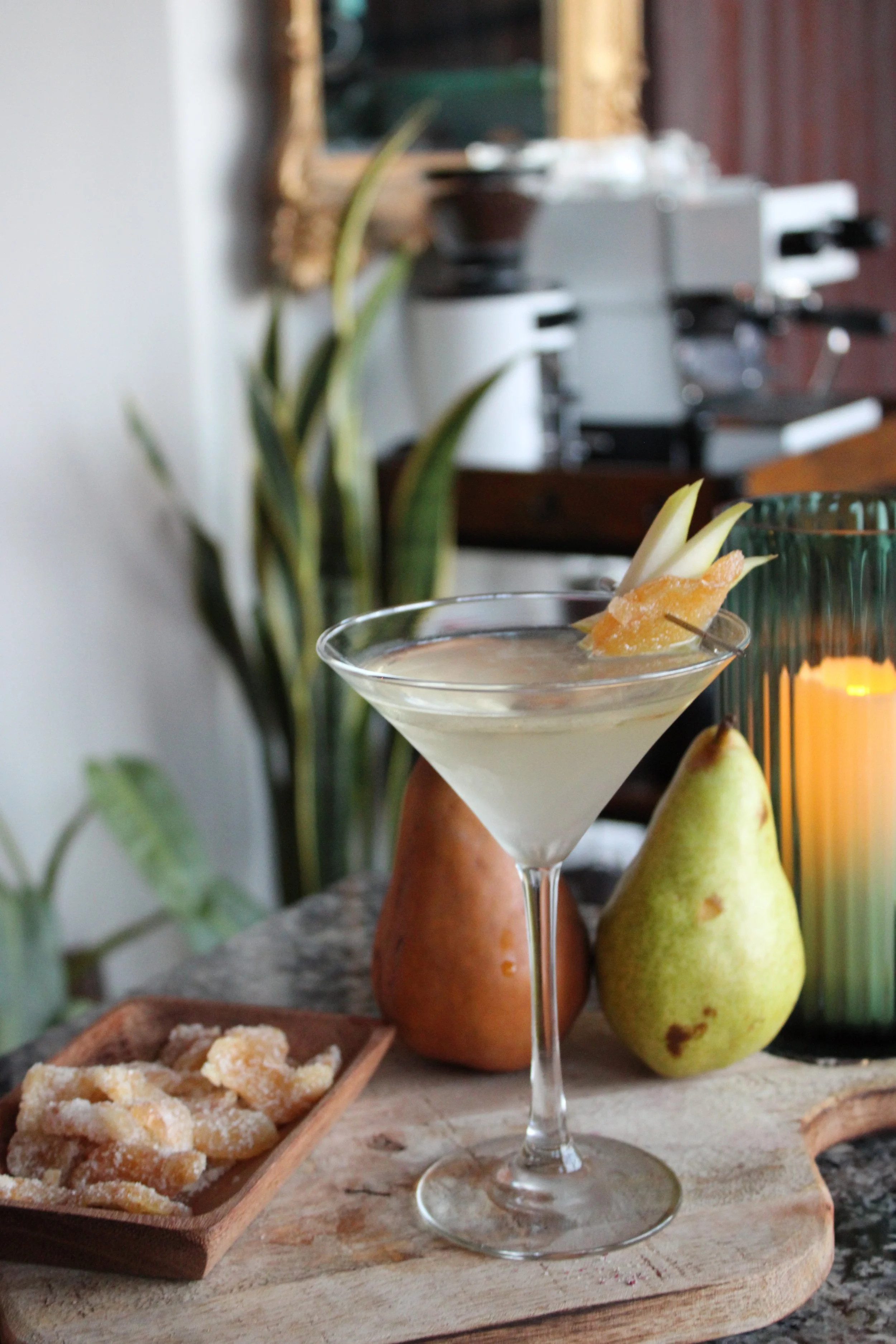 A winter martini that captures the essence of ripe pears and warming spices. This elegant cocktail layers pear vodka with hints of cardamom and ginger, finished with a delicate poached pear garnish that doubles as a sophisticated bite. A celebration of winter's most refined flavors.