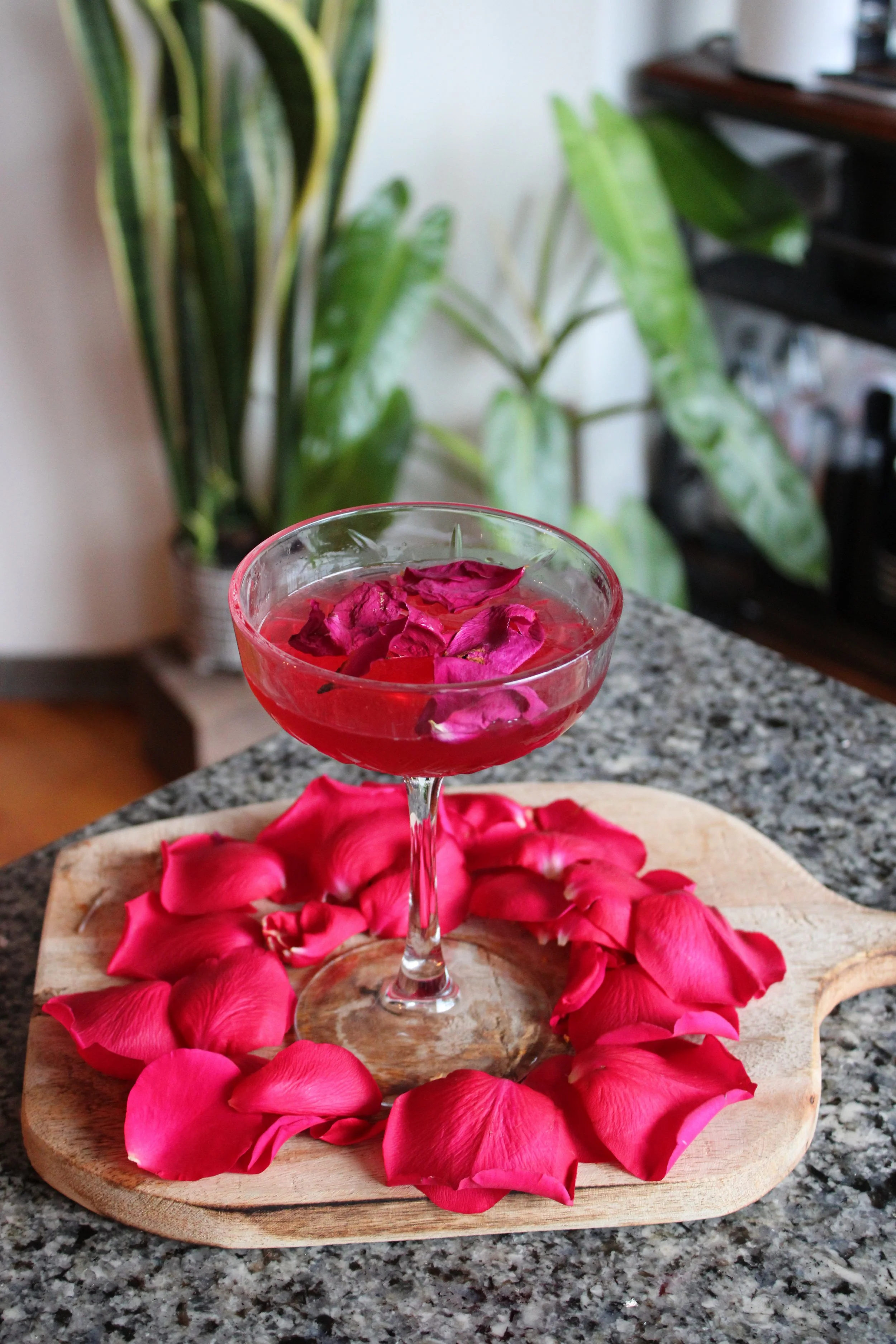 Combine 1 cup water, 1 cup sugar, 2 tbsp dried hibiscus flowers, 2 tbsp dried rose petals