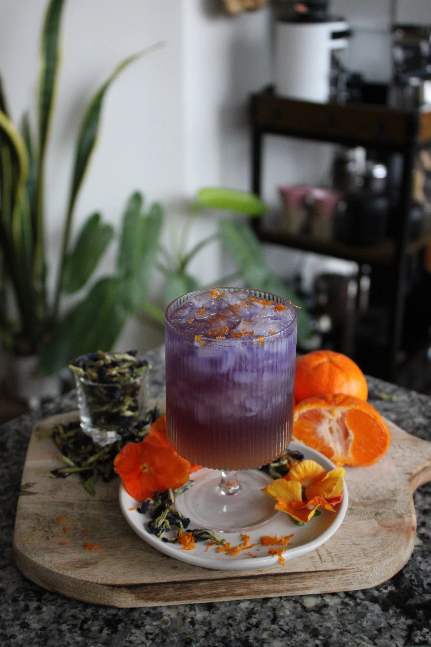 A transformative cocktail that captures the magic of the sea. Butterfly pea flower-infused rum creates a stunning blue base that dramatically shifts colors when citrus is added. Fresh clementine and key lime provide bright top notes, while coconut water adds subtle tropical depth. A sea salt and vanilla mist adds complexity and enhances the drink's ethereal nature.